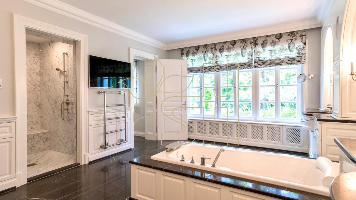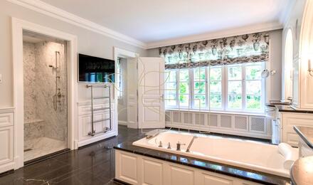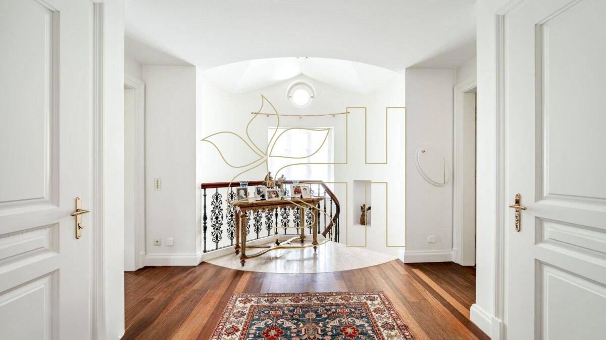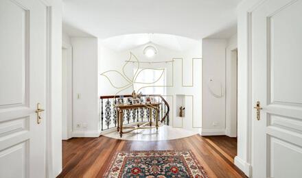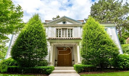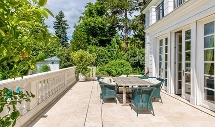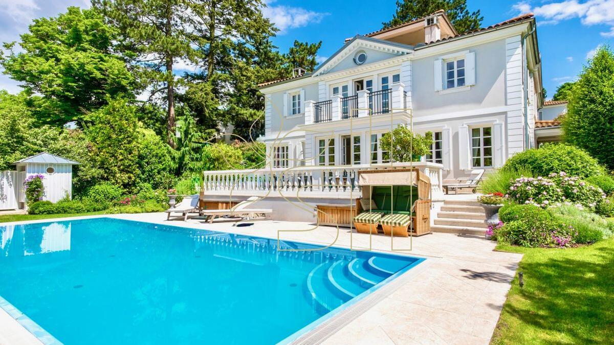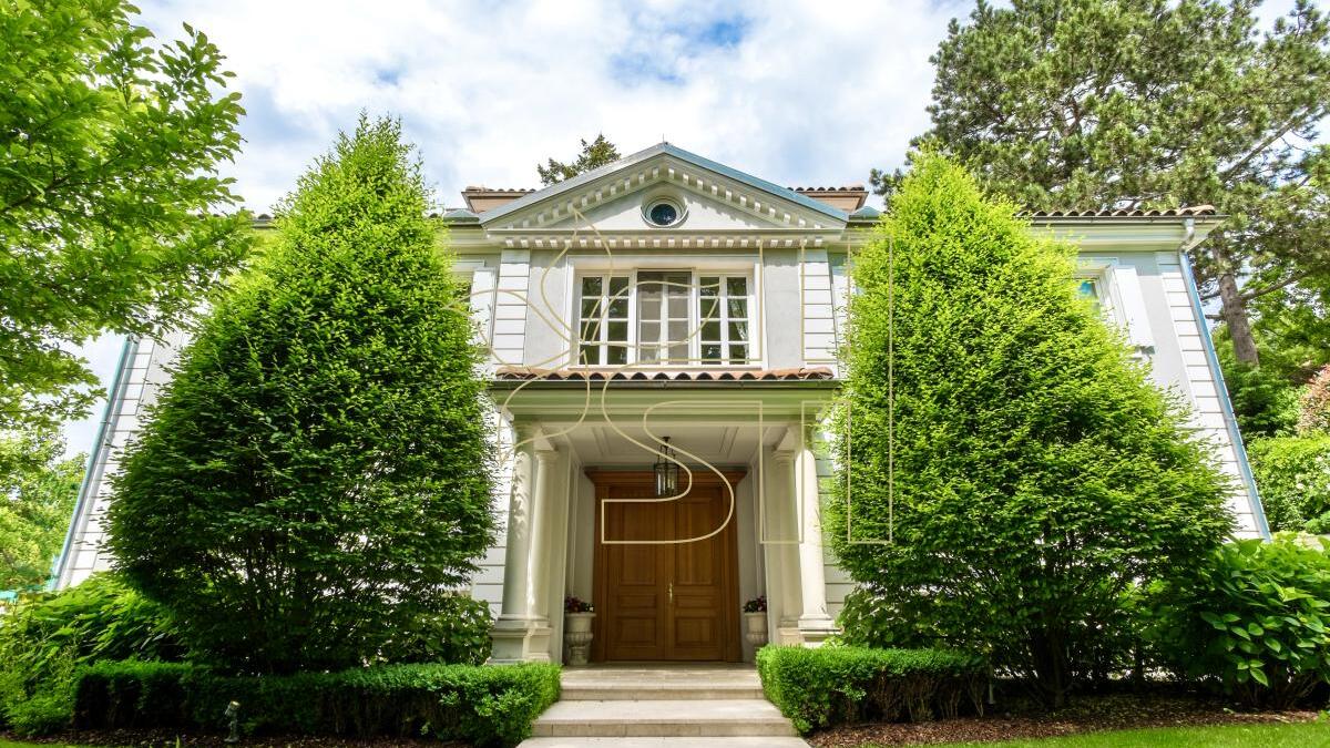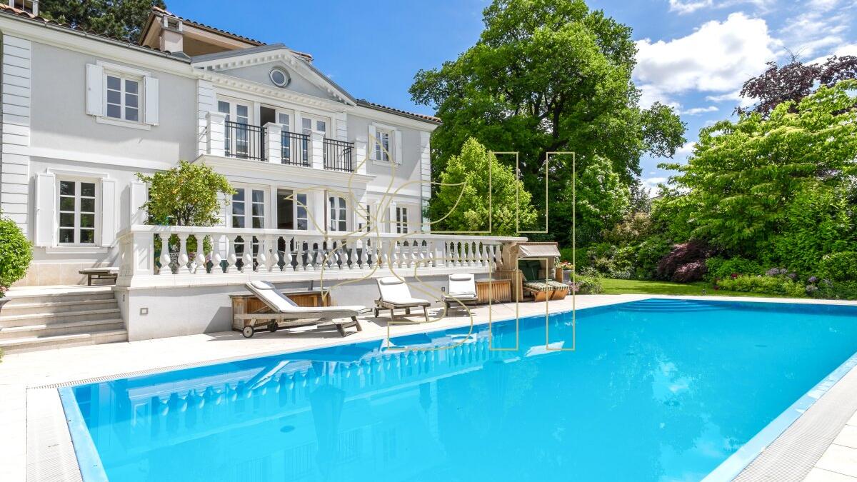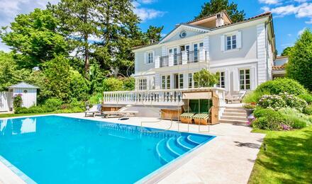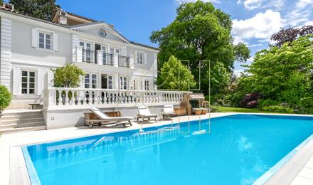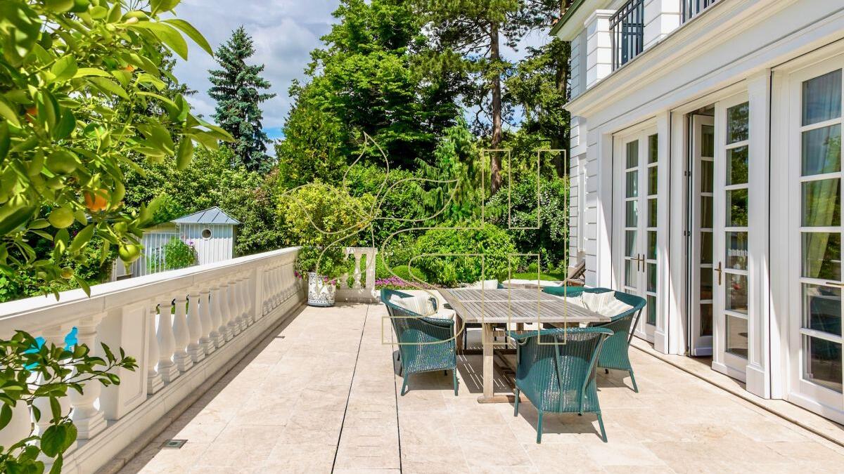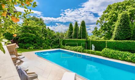 Diese klassische Villa vermittelt Großzügigkeit auf allen Ebenen. Die Wohnebene bietet neben einem großen Entrée mit eigenem Garderobenraum einen herrlichen Wohnsalon mit offenem Kamin und großer Südterrasse, eine holzgeschnitzte Bibliothek mit unfassbaren Details samt Kamin, ein repräsentatives Esszimmer und eine große Küche mit Essplatz und Ausgang auf eine atriumartige Gartenterrasse samt Orangerie. Es stehen weiters eine Master-Suite mit 2 Garderoben und großem Bad, ein weiteres Schlafzimmer mit en Suite Bad sowie 3-4 zusätzliche Schlafzimmer zur Verfügung. Das Kellergeschoss umfasst einen Weinkeller, einen Wellnessbereich, einen sehr großen Wirtschaftsraum, einen kleinen Einliegerbereich, einen Vorratsraum, die Technik sowie die große Garage mit bis zu 4 Stellplätzen. Ein Lift verbindet alle Etagen.