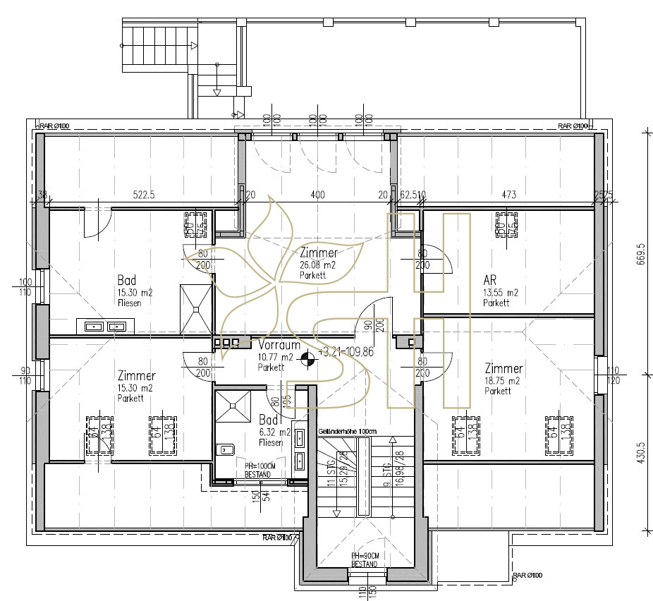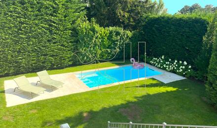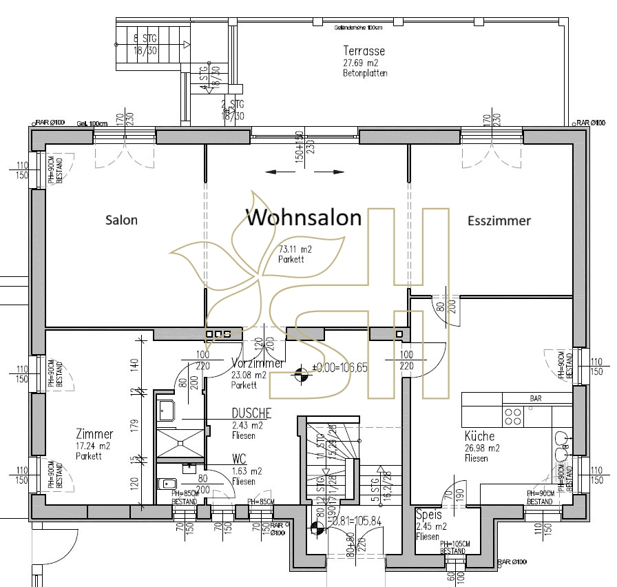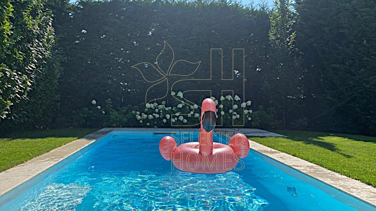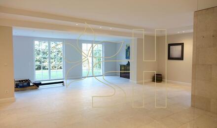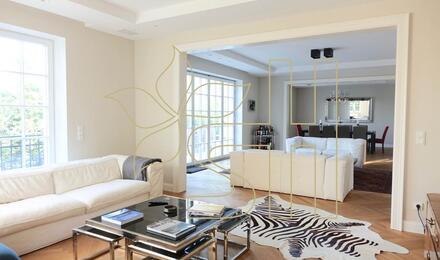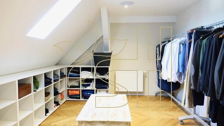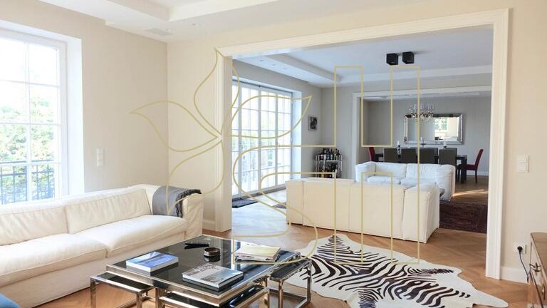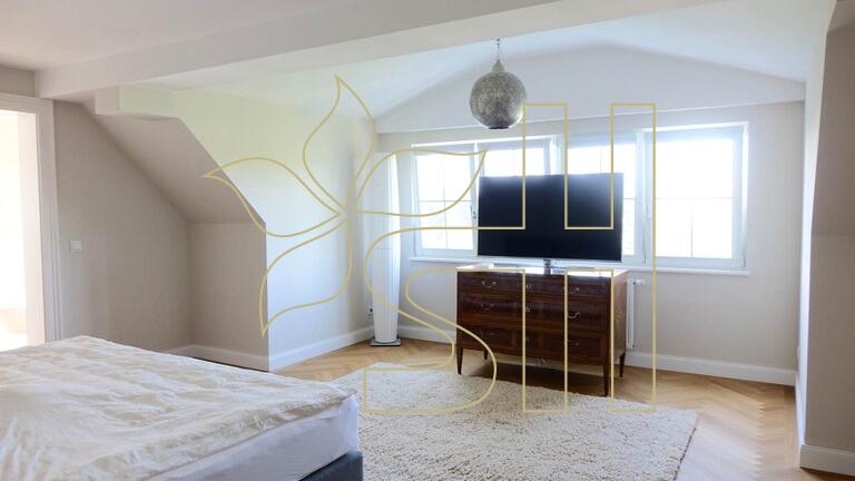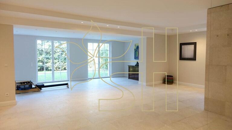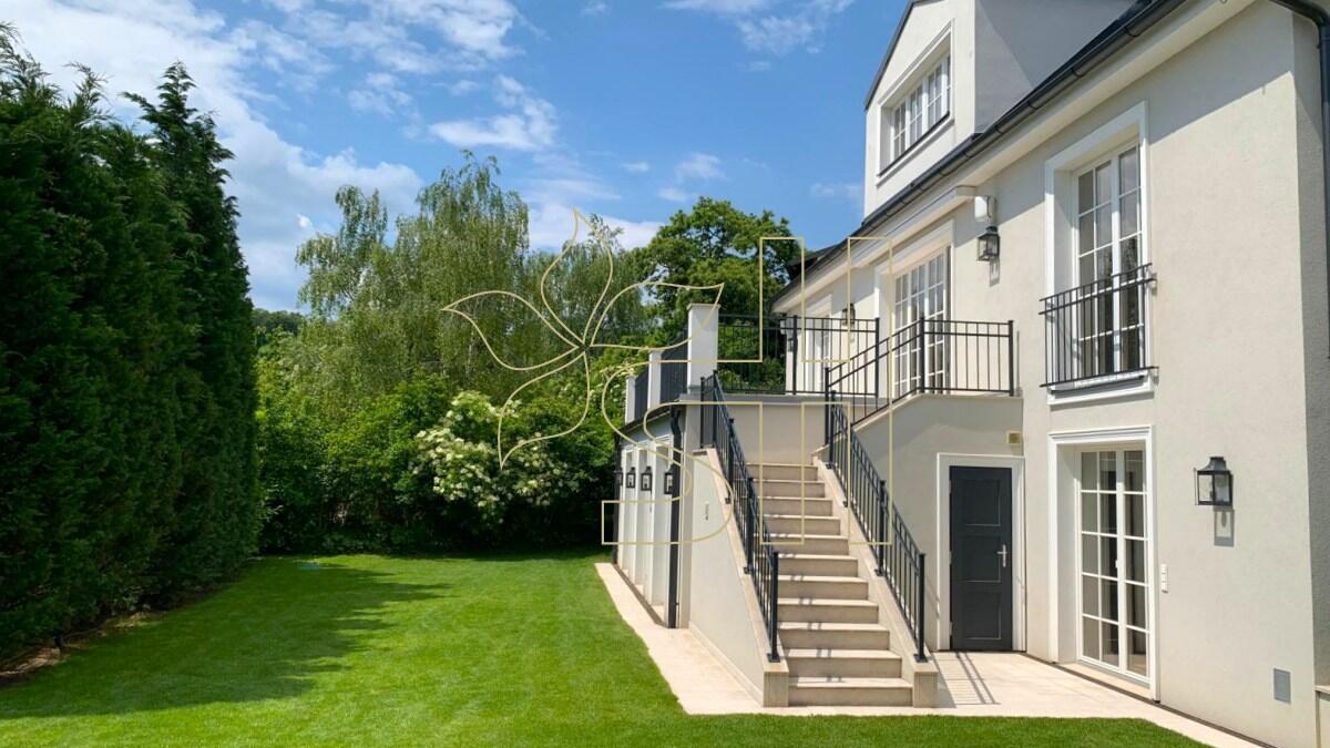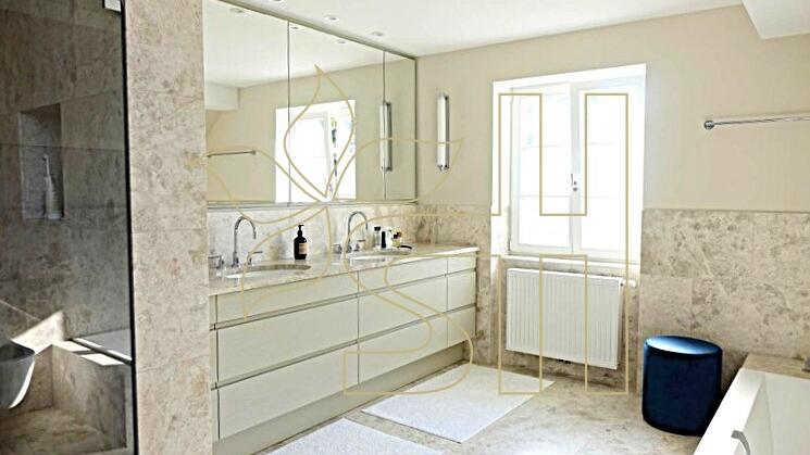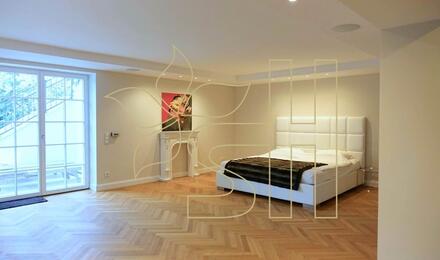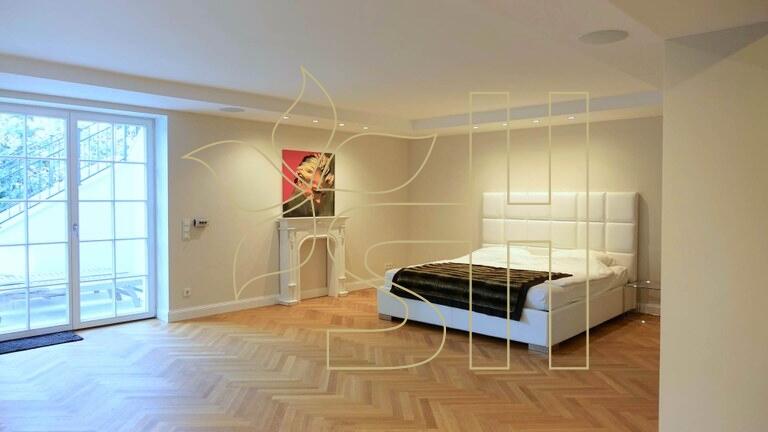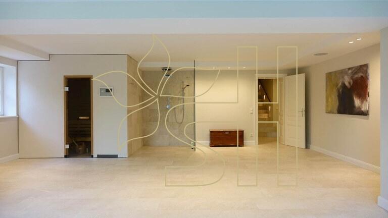 The 3 levels show a representative, 100 m² living & dining area including a huge kitchen and a south facing terrace (38 sqm) as well as up to 6 bedrooms and/or spacious wellness area with sauna and a lot of space for storage. The pool is located in the beautifully arranged south/west garden.